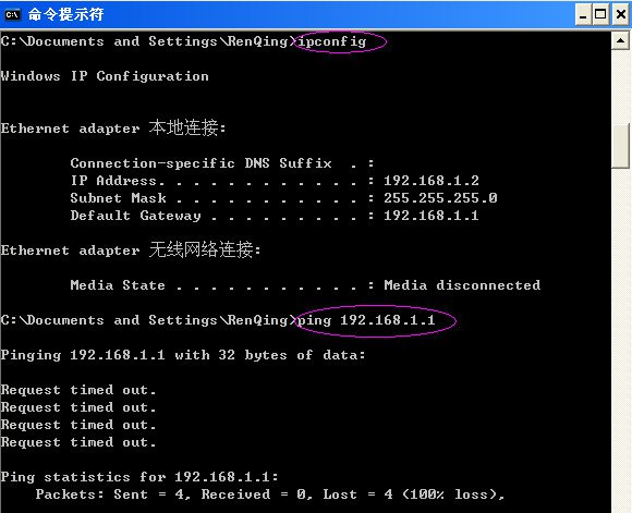 导致此状况出现的原因有以下几种: 光纤猫开启了路由功能,且LAN IP地址与路由器的LAN IP地址相同 美国网件路由WGR614v5的默认登录IP是192.168.1.1,许多路由器品牌也将此值作为路由的默认登录IP,这样的话,一旦用户将两个设备连接到一起就会发生环路造成冲突,电脑仍能从路由器获得到IP地址,在DOS命令行窗口中使用ipconfig命令可查看获得的IP信息,但无法ping通路由器: